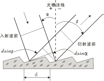 反射式衍射光栅是在衬底上周期地刻划很多微细的刻槽, 一系列平行刻槽的间隔与波长相当,光栅表面涂上一层高反射率金属膜。光栅沟槽表面反射的辐射相互作用产生衍射和干涉。对某波长,在大多数方向消失,只在一定的有限方向出现, 这些方向确定了衍射级次。如图所示,光栅刻槽垂直辐射入射平面,辐射与光栅法线入射角为α,衍射角为β,衍射级次为m,d 为刻槽间距,在下述条件下得到干涉的极大值:mλ=d (sinα+sinβ)。