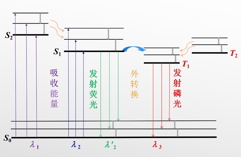 其本质是物质分子吸收了激发光的能量,短波长的激发光使其周围的电子由基态跃迁到能量更高的第一激发态,或是第二激发态。在激发态的电子非常不稳定,它们会以多种不同的形式释放能量,从而回到基态,这是一个很复杂的过程。