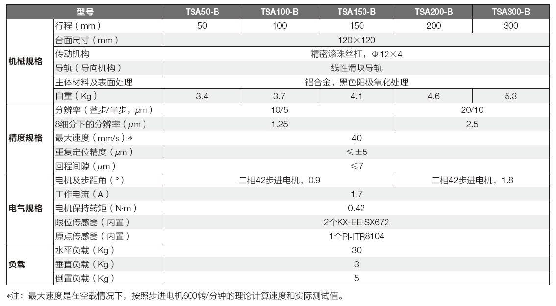 TSAxx-B系列方导轨电动直线滑台特点:• 工业级滚珠丝杠(导程4mm),标配二相步进电机,性价比高