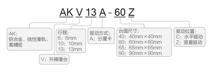 AKV系列铝合金高精密手动升降滑台命名规则: