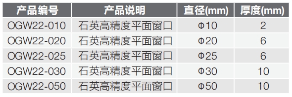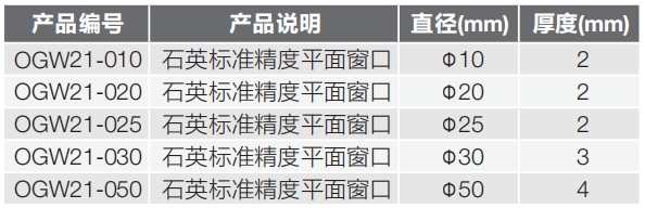 石英 | 透射范围:185~2300nm 折射率:1.4858@308nm 低热膨胀系数:0.54×10-6K |
