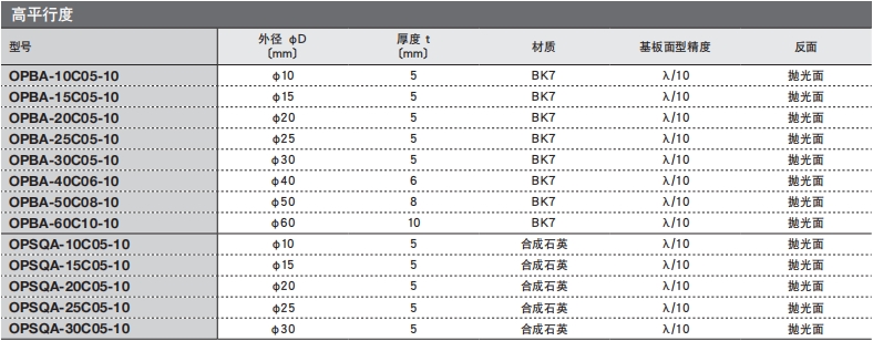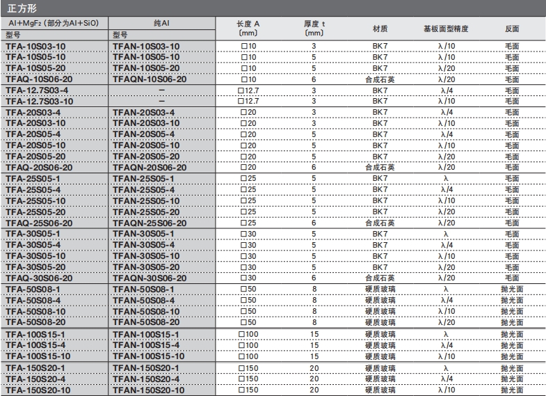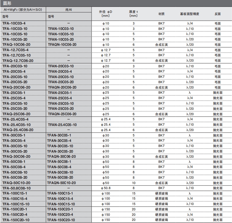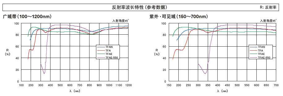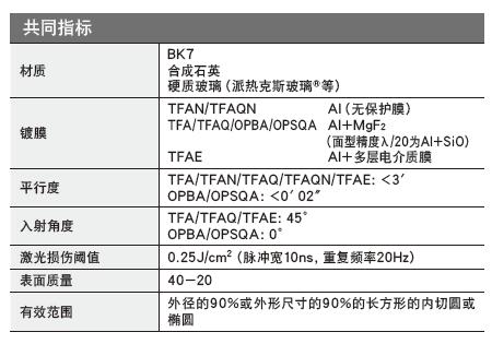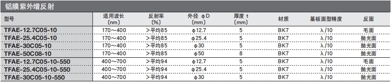 · 有只蒸镀铝膜的(TFAN/TFAQN),和为防止损伤在铝膜上镀有保护膜的(TFA/TFAQ),为提高紫外光反射率镀有保护膜的(TFAE) 和在平行平面基板上镀有保护膜的铝膜反射镜(OPBA/OPSQA)四种类型。