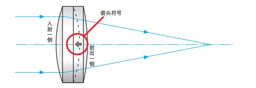 ?入射消色差透镜的平行光有方向性,要从曲率半径较小的一侧(有箭头符号指向的一面)射入平行光。从相反的一侧射入平行光时,会产生色差或球差,焦点光斑会变大。