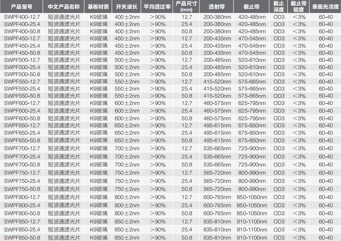 带通滤光片与截止滤光片往往指的是同一类产品,比如说短波截止滤光片(Short Wave Cutoff Filter)与长波通滤光片(Long Wave Pass Filter)是同一产品。长波截止滤光片与短波通滤光片指的也是一种产品。我们习惯上,更常用长波通(LP)和短波通(SP)来区分。
