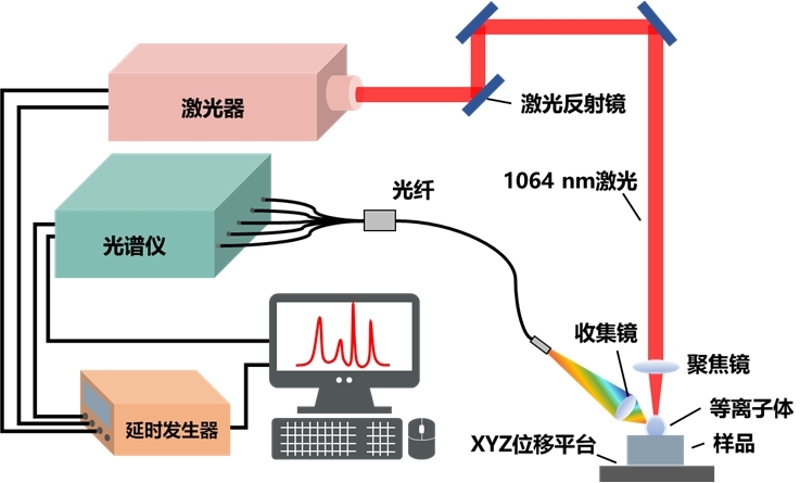 激光诱导击穿光谱实验是通过超短脉冲激光聚焦样品表面形成等离子体,对等离子体发射光谱进行分析来确定样品的物质成分及含量。超短脉冲激光聚焦后能量密度较高,可以将任何物态(固态、液态、气态)的样品激发形成等离子体,LIBS技术(原则上)可以分析任何物态的样品,仅受到激光的功率以及探测光谱仪的灵敏度和波长范围的限制。几乎所有的元素被激发形成等离子体后都会发出特征谱线,因此,LIBS可以分析大多数的元素。基本原理