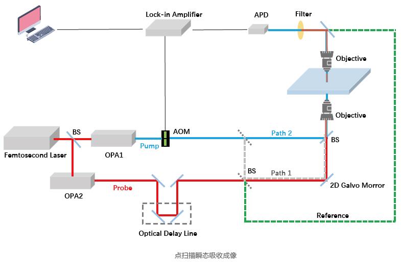 Omni-TAM900宽场飞秒瞬态吸收成像系统原理如下图所示,经过飞秒激光器和光学参量放大器(OPA)之后出来的飞秒激光,通过显微镜的光学系统进入,并作为泵浦光源激发样品,而另一束经过空间调制的探测光在一定的时间延迟之后也经过显微系统到达样品,样品在激发态对探测光产生的吸收情况会被显微镜上的sCMOS 相机记录下来。通过调节光学延迟线(Optical Delay Line),得到样品在不同延迟时间下的sCMOS图像。