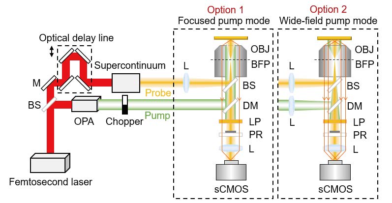Omni-TAM900 可以有两种成像模式(如下图所示): 聚焦泵浦光模式(点泵浦,宽场探测)和宽场泵浦光模式(宽场泵浦、宽场探测),前者主要用于研究载流子的迁移,后者用于检测载流子的空间分布状况。
