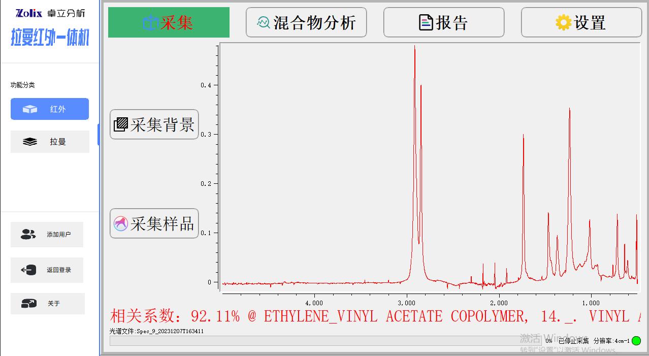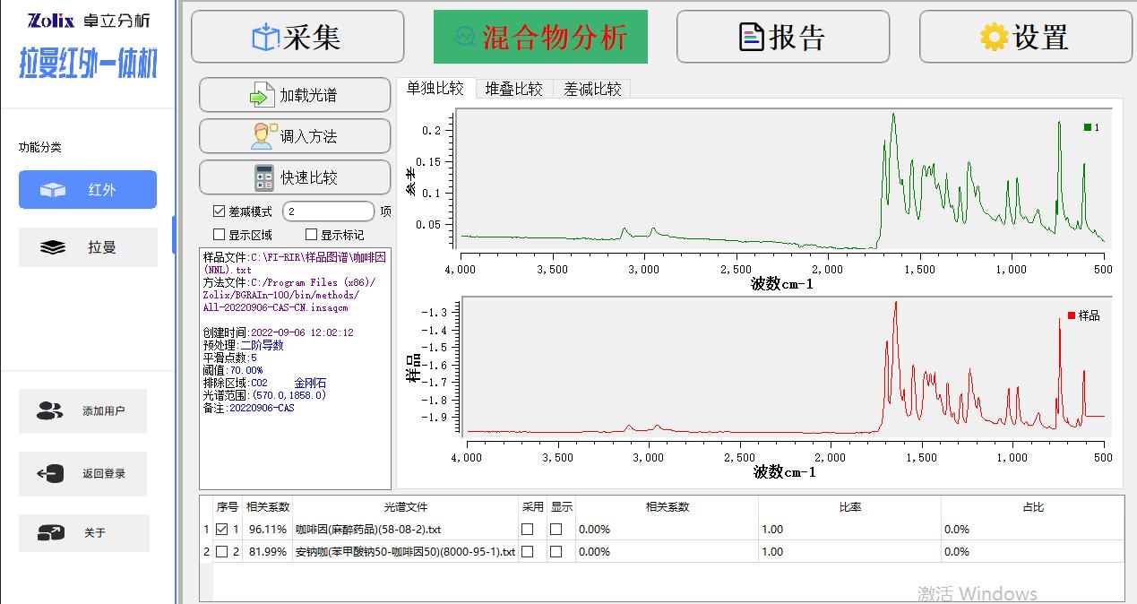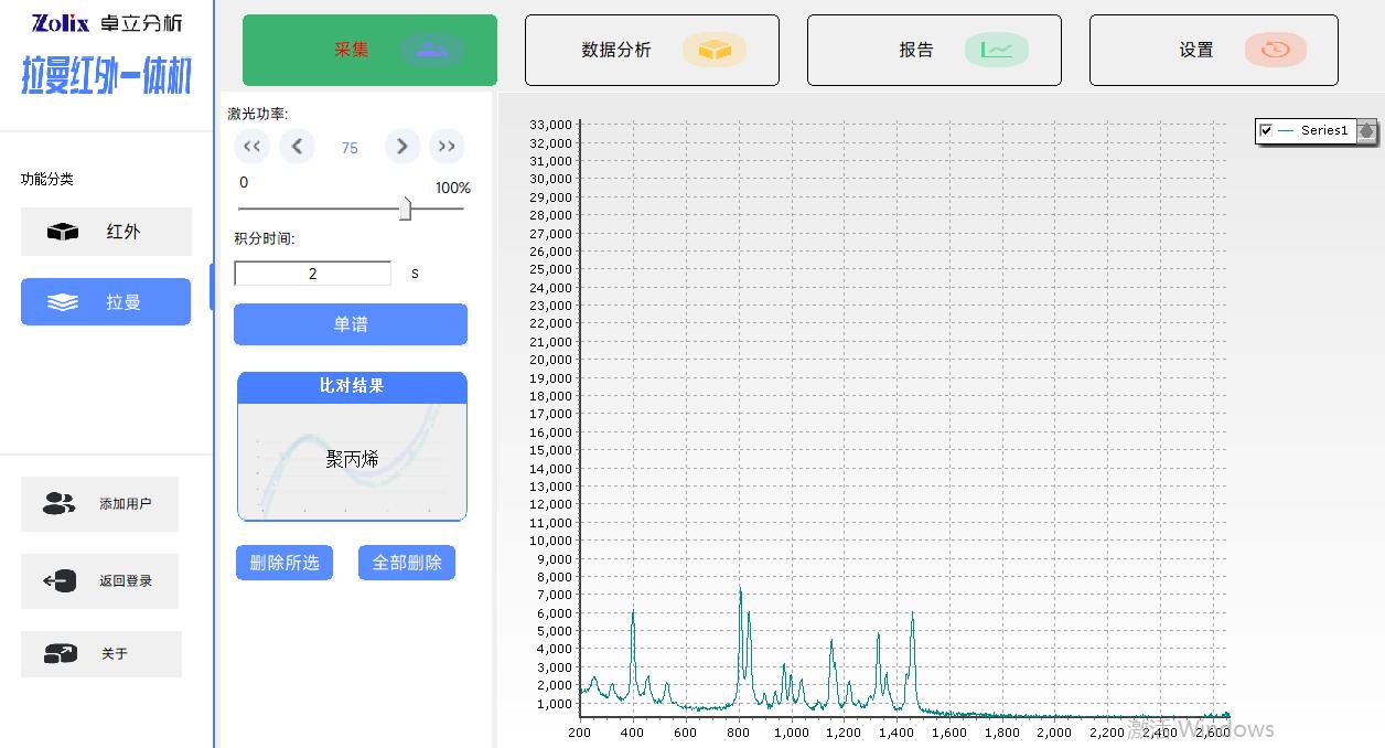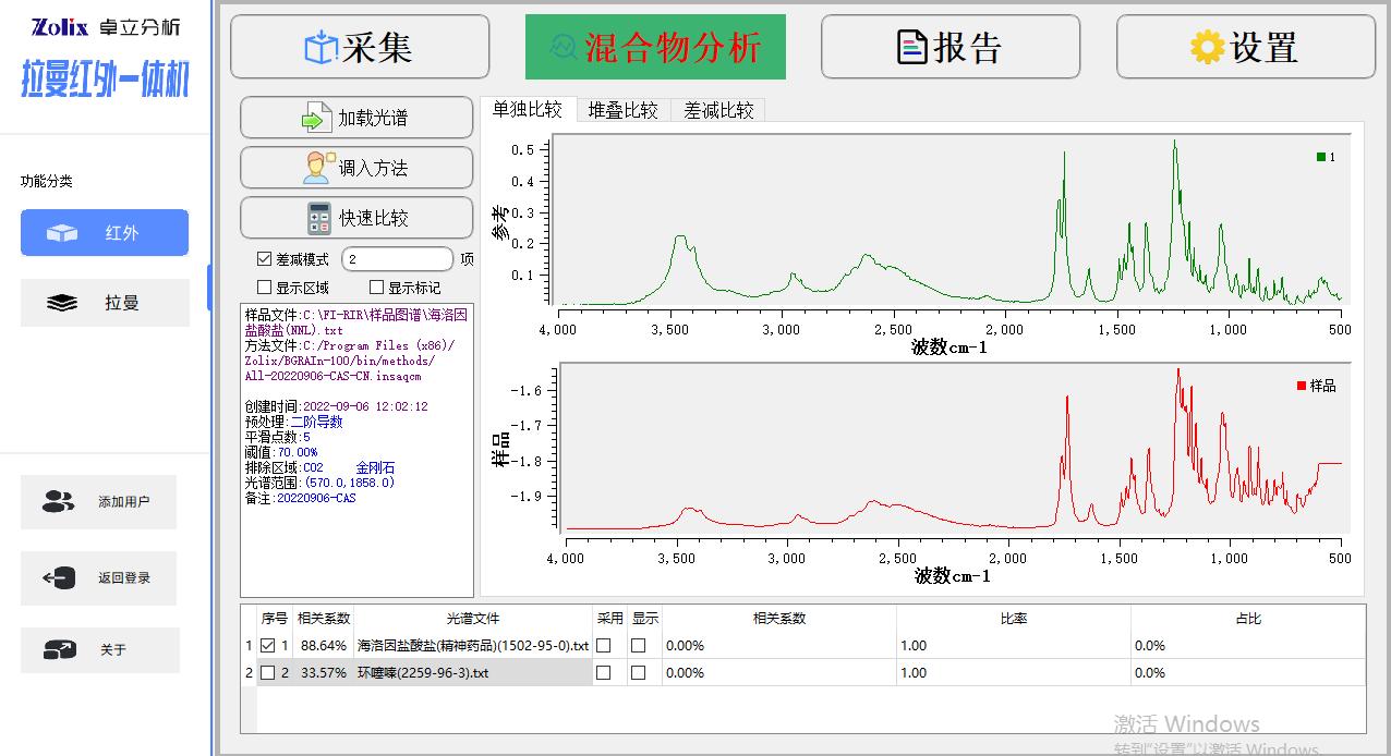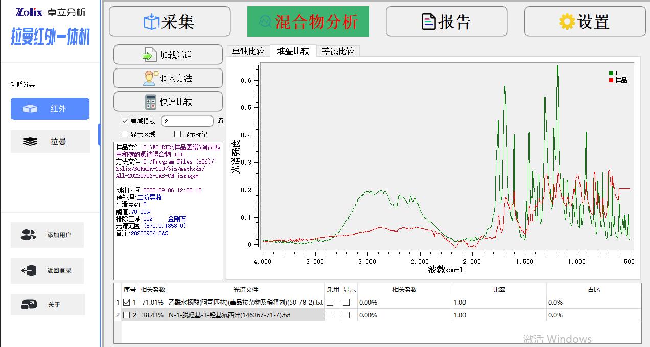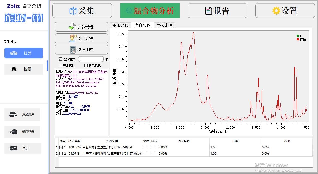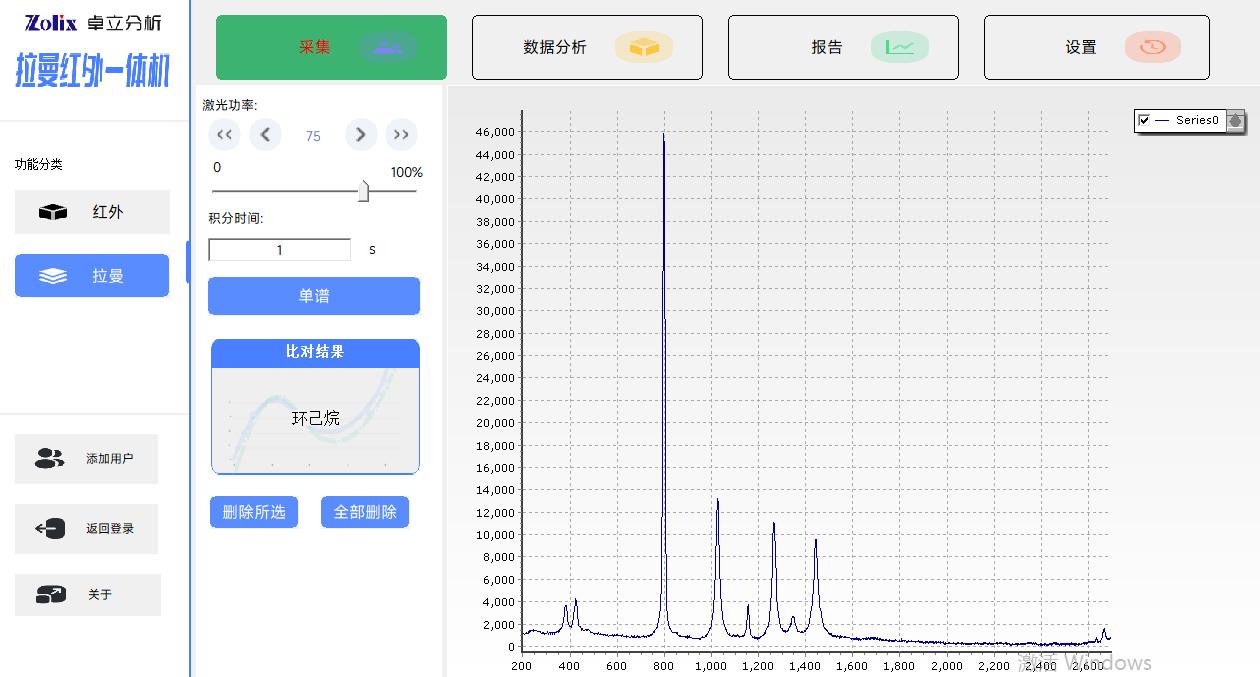 Win10操作系统下的全中文版处理软件, 红外模组功能包括:红外光谱测量功能、光谱数据预处理功能、谱图快速比较功能、标准谱峰检索功能、用户自建标准谱库功能、定量分析功能、自动扣除金刚石/CO2吸收峰功能、智能峰位识别报警功能、一键式测评功能、报告自动生成及打印功能等 拉曼模组功能包括:拉曼光谱测量功能、谱图快速比较功能、谱图自动保存、批量删除,报告自动生成及打印功能等 |