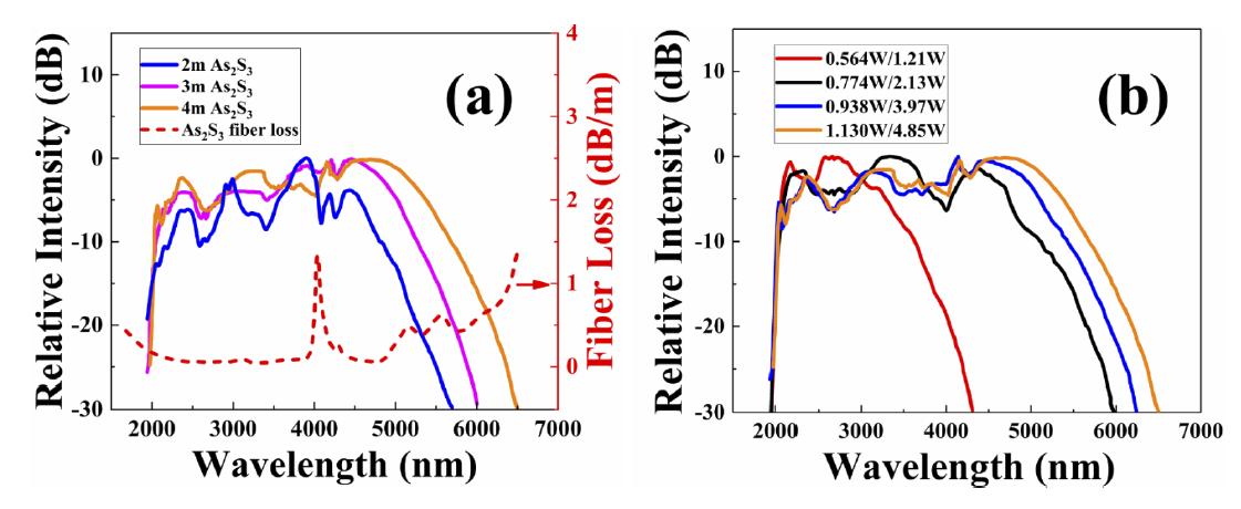 (a) 不同长度的As2S3光纤输出光谱测量; (b) 4m As2S3 光纤在不同输入光能量下的输出光谱