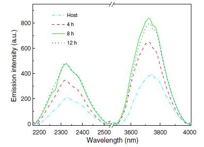 1、中红外发光硫卤玻璃陶瓷中红外发光研究[3],通过引入Ga2S3纳米晶,极大增强了硫卤玻璃陶瓷位于2.3和3.8μm处的中红外发光强度。下图为440℃不同热处理时间下的硫卤玻璃陶瓷中红外发射光谱测试,浅蓝曲线为主体玻璃陶瓷的发光。