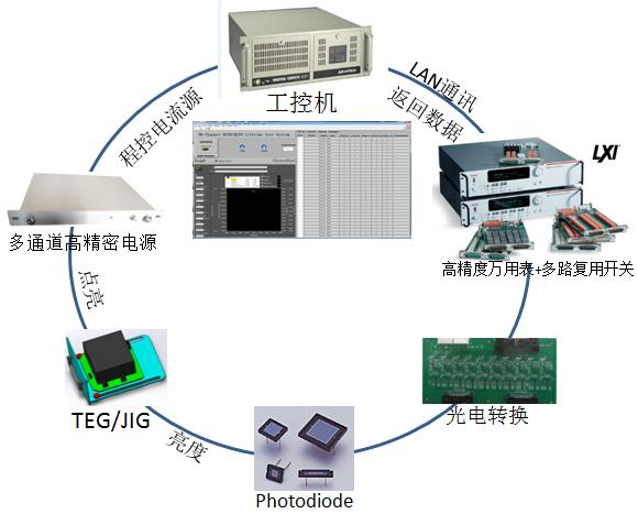 该系统是集成系统检测软件、多通道电源、硅光电二极管光电转换、工控机为一体的自动化检测系统,主要应用于OLED TEG/JIG加速老化寿命测试。