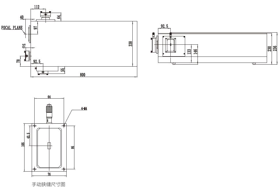 缝宽0.01-3mm连续手动可调,可选配自动狭缝。缝高:2、4、14mm可选 |