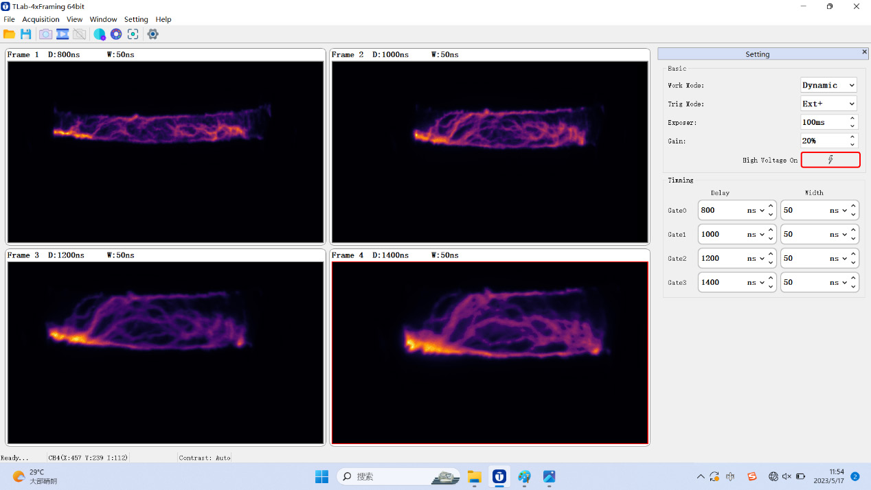 延迟800ns-1.4us放电,间隔200ns, 门宽50ns, 清晰可见放电区域逐步膨胀过程。