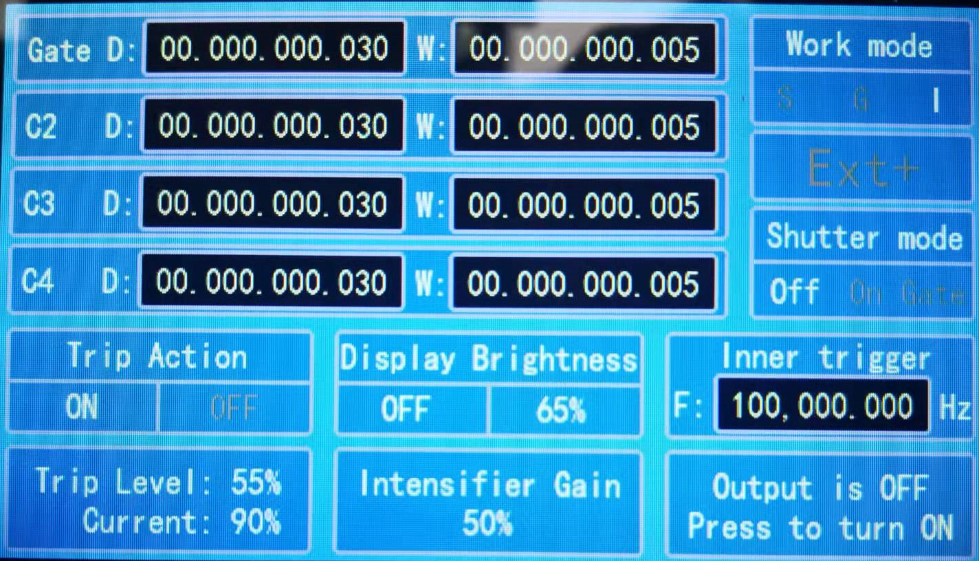 ● 门控Gate及同步输出信号三路输出调节,包括信号宽度以及延迟时间;