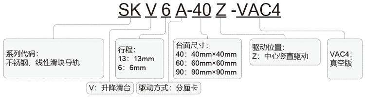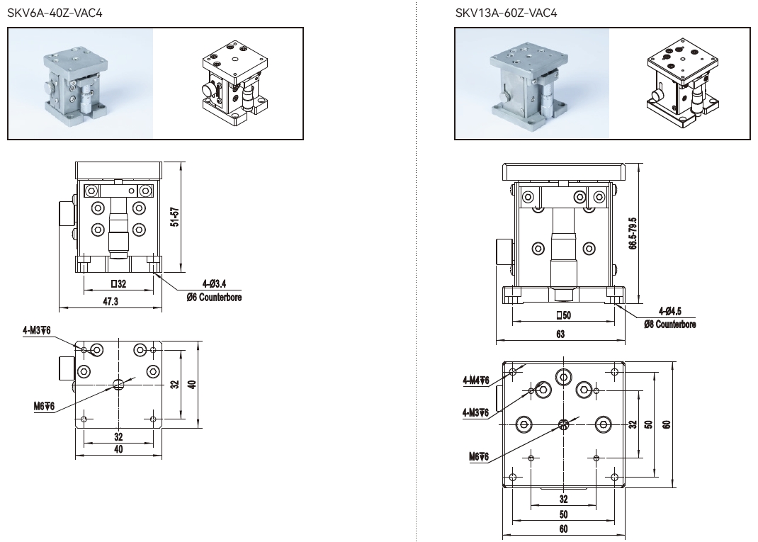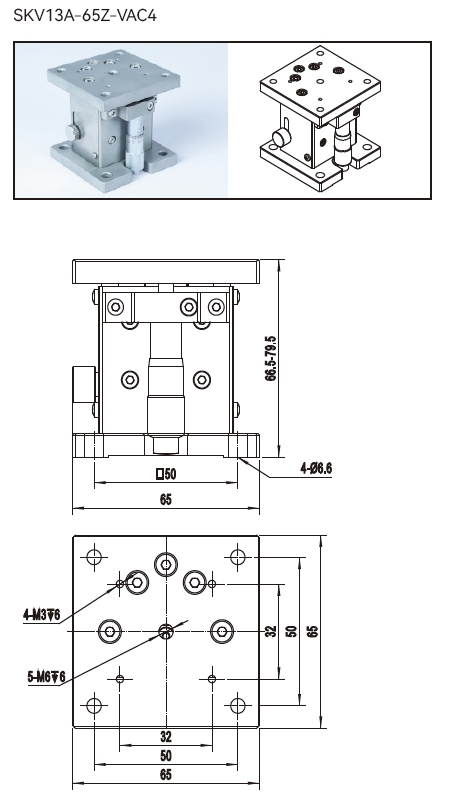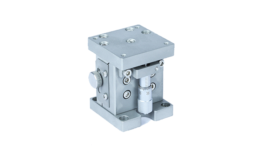 SKV 系列是采用直顶式结构的高精密手动升降滑台。该系列产品采 用分厘卡驱动,使用直线滑块导轨导向,保证台面升降时具有很好的运动 精度。台面多种标准孔位的安装孔适合不同需要, 下方标准固定孔方便将 其与其他滑台连接,组成多维移动台。