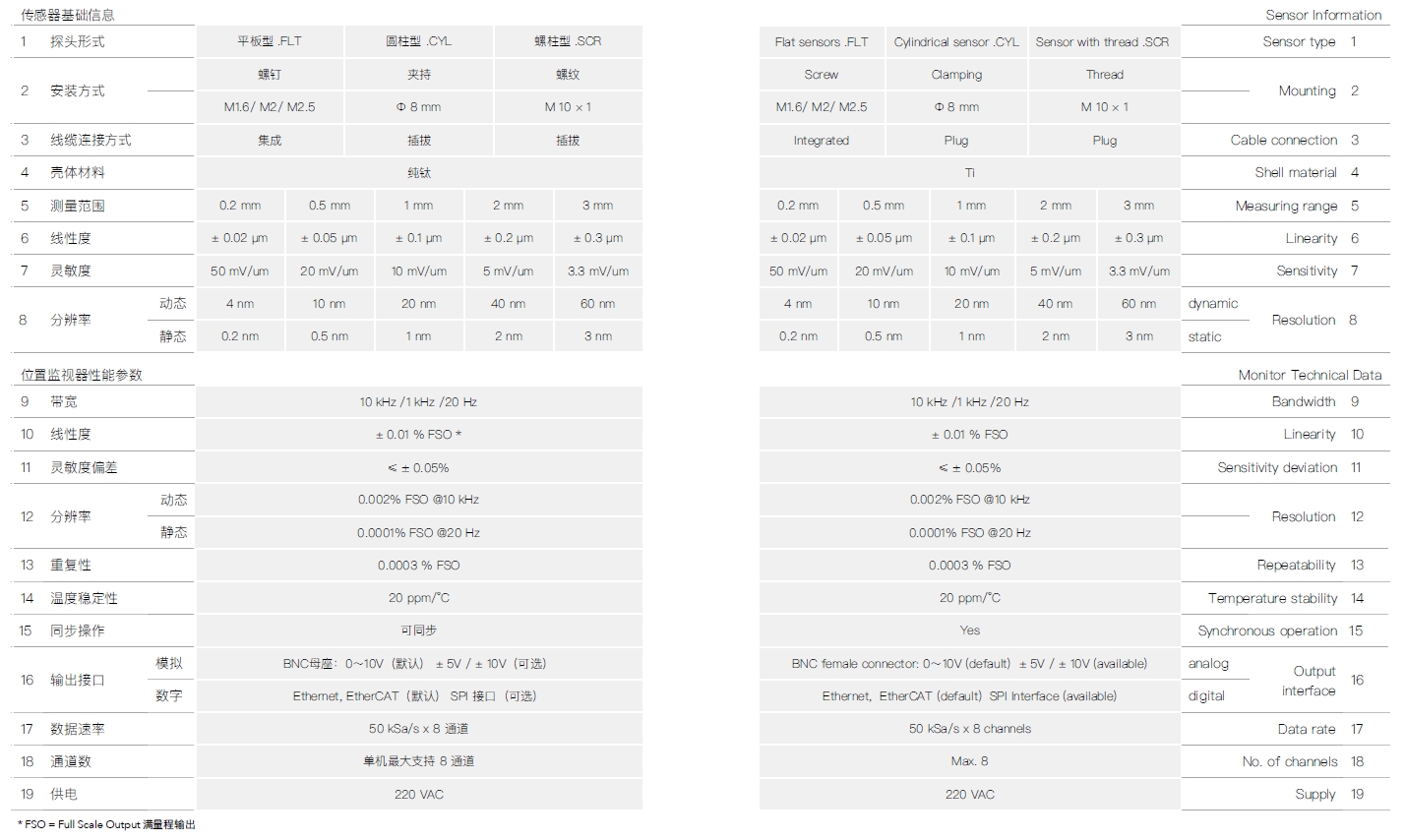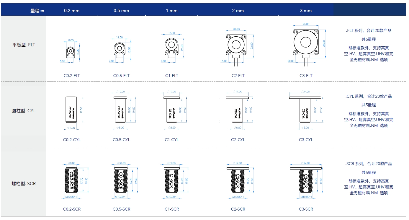 提供平板、圆柱和螺柱三种探头形式,量程覆盖范围 0.2 mm, 0.5 mm, 1mm, 2mm & 3mm,并提供高真空.HV, 超高真空.UHV 和完全无磁材料.NM 的多版本选择