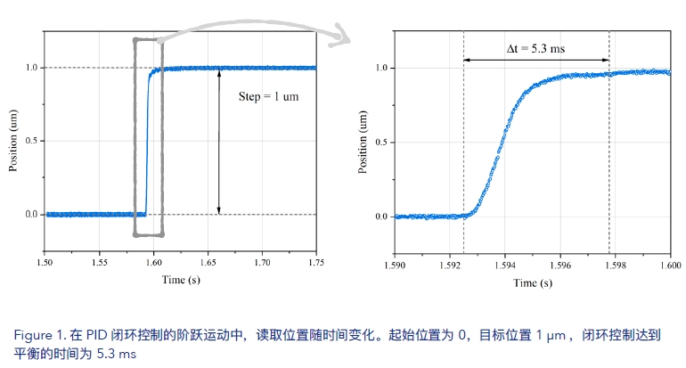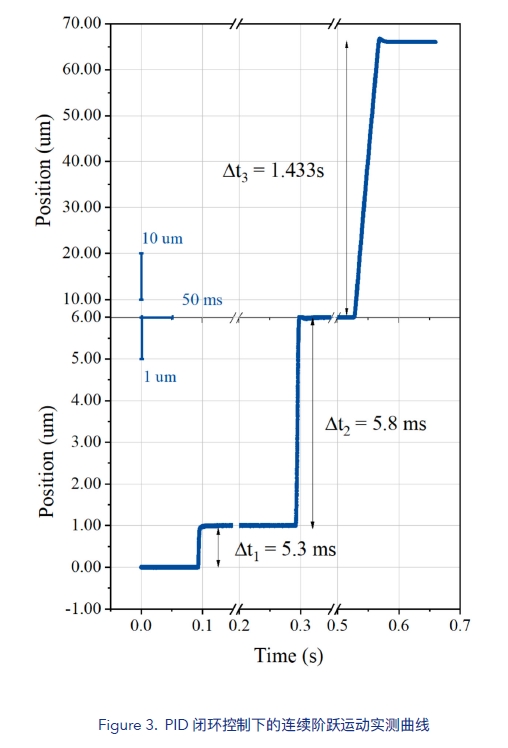 运动闭环控制策略如 Figure 2 所示。系统可在 5.3 ms 内实现启动、加速、匀速、减速和停止五个运动过程,并完成 1 !m 的平滑阶跃,且无过冲现象。 Faraday.03 20 !s 进行一次位置更新,为 PID 动态控制提供了关键支持。