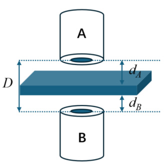 测量原理:       在被测导体两侧相对安装两只传感器( Sensor A 和 Sensor B),其端面之间的距离 D 固定。 厚度的计算公式为 Thickness= D - (dA  + dB),其中 dA   和 dB 分别为两只传感器所测到的金属表面距离的精确读数。