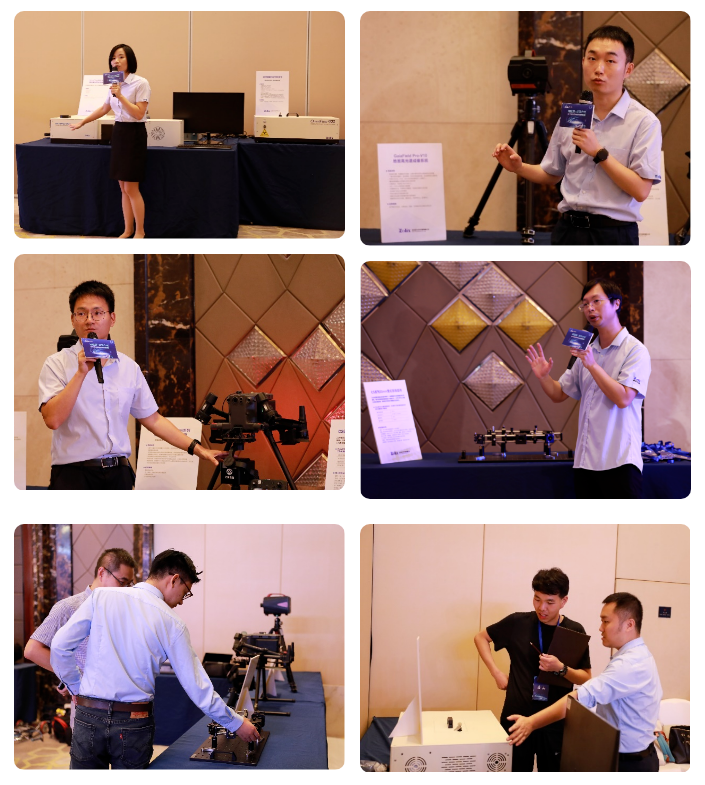 高端国产仪器展示区展示了模块化Omnifluo900稳态瞬态荧光光谱仪,具有国标级别安全防护的X射线辐射发光样品仓,基于无人机系统机载高光谱成像系统和地面高光谱成像系统,可以进行更便捷光学系统搭建的CS系列笼式系统组件,具有高精度,纳米级分辨率的室温压电线性位移台。在会议茶歇间隙,来自快盈lV公司的产品专家们对展示的仪器进行了现场详细的讲解。