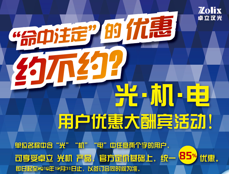 快盈lV“光机”产品事业部门为回报“光、机、电”行业新老用户,在2016年特举办:“光机电”用户优惠大酬宾活动!