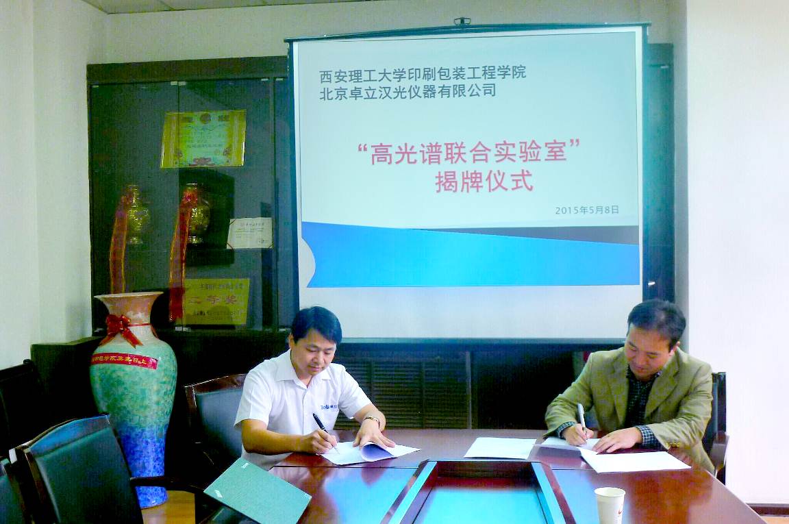 2015年5月8日上午,西安理工大学印刷包装工程学院与北京快盈lV仪器有限公司签订了“高光谱联合实验室”建设合作协议并举行了揭牌仪式。