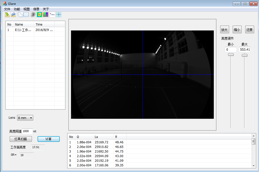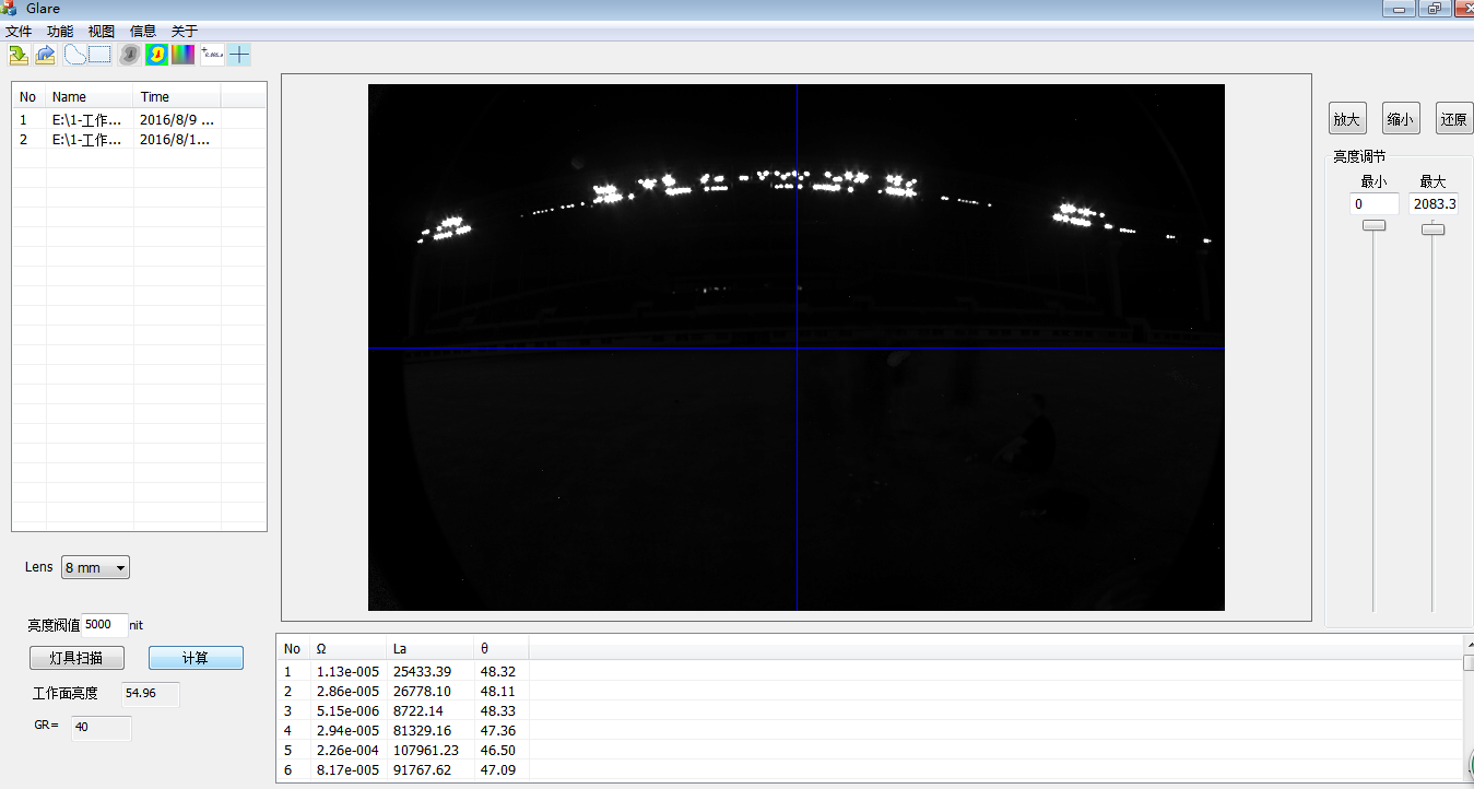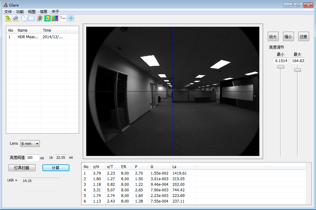 Glare眩光测量软件解决了不同的环境光源和观察者视角的空间位置对应关系,合理准确地描述了光在人眼的散射效应。对不同的照明条件和环境,做了相应的测试方案,解决了室内、室外等不同场景的眩光测试。