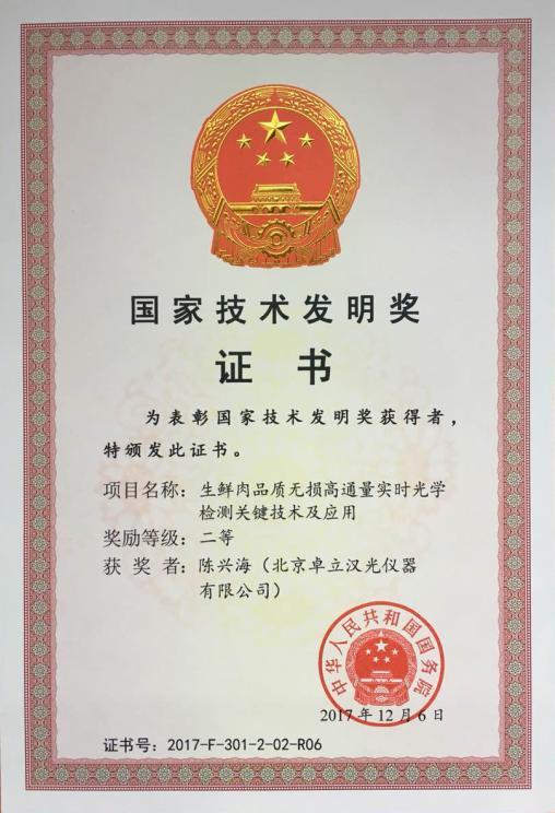 我司技术总经理陈兴海与中国农业大学彭彦昆教授合作完成的“生鲜肉品质无损高通量实时光学检测关键技术及应用”获得国家技术发明二等奖。