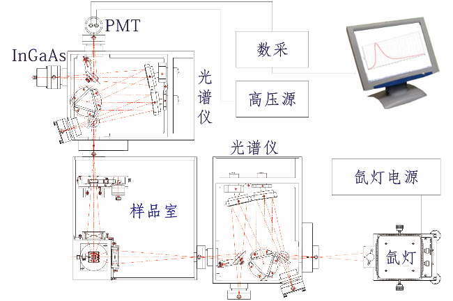 基本型OmniFluo “卓谱”系统,主要实现荧光光谱和荧光激发光谱测量,其系统架构与荧光分光光度计基本一致,却有效的增加了近红外升级功能,扩展了测量范围。