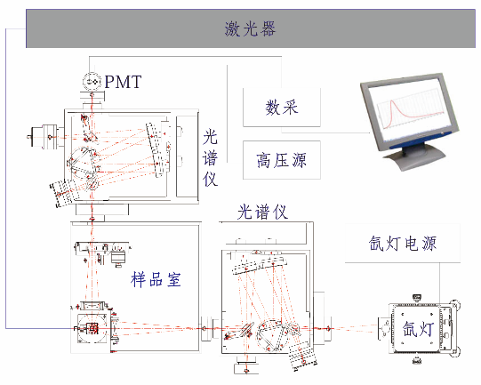 OmniFluo “卓谱”系列稳态荧光光谱系统主要系统构成 1.激发光源部分:紫外-近红外波段各种波长可调单色光源或单波长激光器 2.光谱采集部分:影像校正光谱和高灵敏型科学级CCD或单点探测器和数据采集器 3.样品室部分:固体粉末样品台、超低温样品台等可选 ![]() |