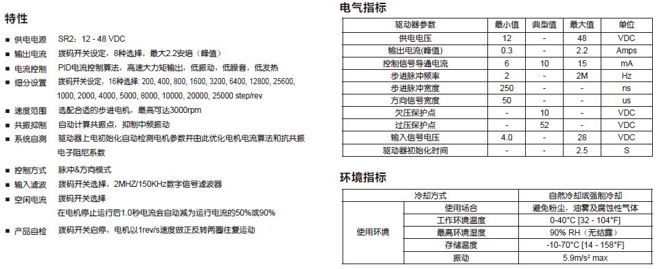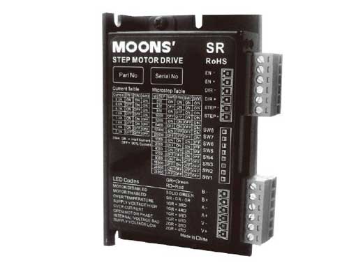 SR 系列两相步进电机驱动器是基于PID 电流控制算法设计的高性价比细分型驱动器,具有优越的性能表现,高速大力矩输出,低噪音,低振动,低发热,特别适合OEM 客户的大批量应用场合。SR2 驱动器可通过拨码开关选择运行电流和细分,有16 种细分,8 种电流供选择,具有过压,欠压,相电流过流保护,其输入输出控制信号均采用光电隔离。