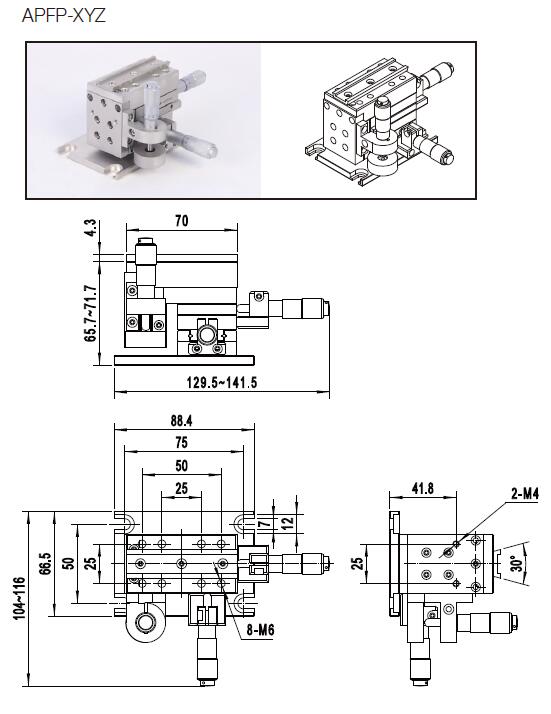APFP 系列产品属于高精密型手动滑台,此系列主体材料采用430 不锈钢,为交叉滚柱导轨、分厘卡或螺纹副驱动、弹簧复位,该系列产品具有高精度和不大于2μm 的灵敏度。APFP系列提供3 ~ 6 维的整体式产品,适合于手动调整精度要求较高的领域。