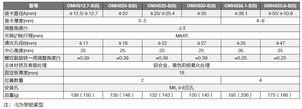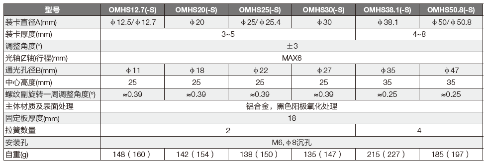 • 每个尺寸的调整架,包含多种镜片装卡方式,包括:封闭顶丝式(标准型)、开口顶丝式(-B型)、封闭压圈式(-C型)