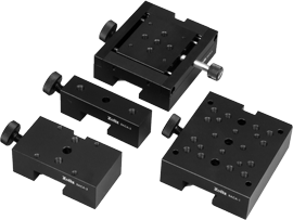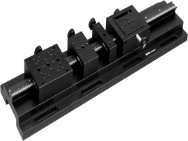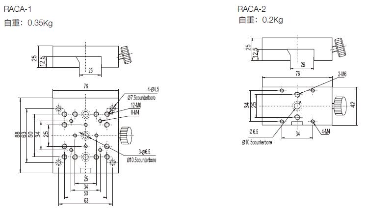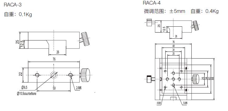 采用燕尾结构,与RAOB 系列导轨配合使用,调整方便,重复性好。带塑料头的刚性锁紧手轮,锁紧牢固,不伤光具座。多种孔位的安装孔适用性强。各种宽度的滑动座适合不同距离的需要。特别是RACA-4 滑动座可横向微调,调整机构为M6×0.25 细牙螺杆驱动,精密线性导轨导向,弹簧复位,精度高,稳定性好。