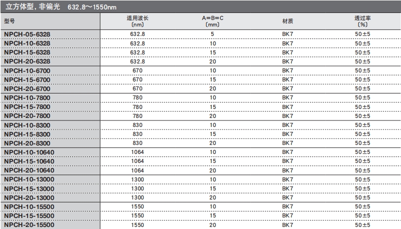 OBCL20-632.8-R5 | 632.8nm分束立方体 | λ/4 | R=50%,T=50% | 20 |