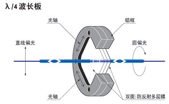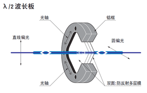 ● 波长板有可以旋转偏光方向的1/2波长板和可以将直线偏光变换为圆偏光的1/4波长板2种类型。