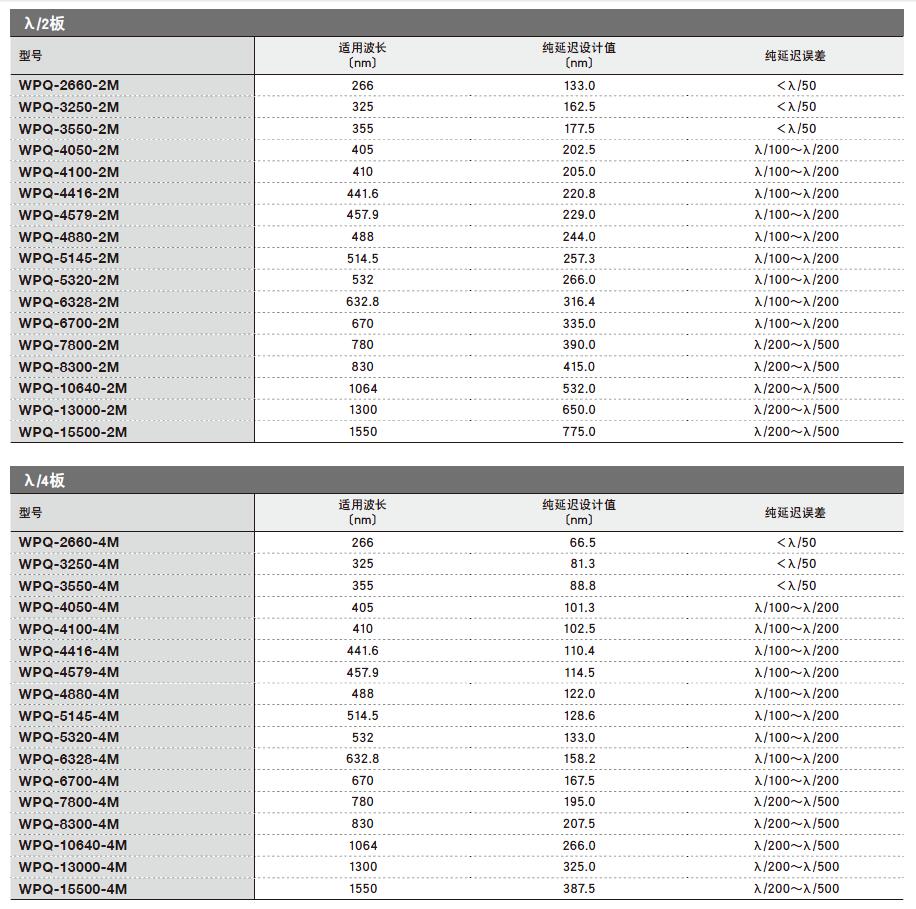 QWZO系列石英零级波片选型表: