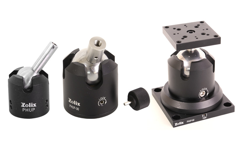 PHUP 系列万向关节座采用万向关节机构,可实现空间任意位置的定位功能,设计巧妙,锁紧后稳定、可靠。自带安装孔或安装板,可固定接杆、杆架或尺寸合适的手动位移产品,使用方便。