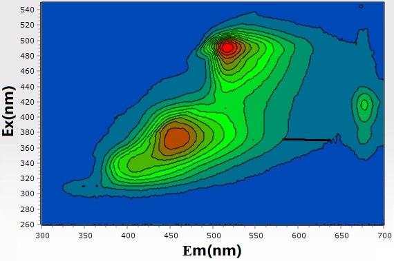三维荧光光谱(EEMs)是将荧光强度以等高线方式投影在以激发光波长和发射光波长为纵横坐标的平面上获得的谱图,图像直观,所含信息丰富。