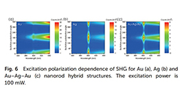 Ag纳米棒混合结构的SHG强度最高,Au纳米棒混合结构的SHG强度最低,而Au–Ag–Au纳米棒混合结构的SHG强度介于两者之间。这种差异主要归因于Ag和Au的SPR效应以及纳米结构设计的不同。通过合理设计纳米结构和优化激发条件,可以有效调控SHG强度,实现对非线性光学特性的优化